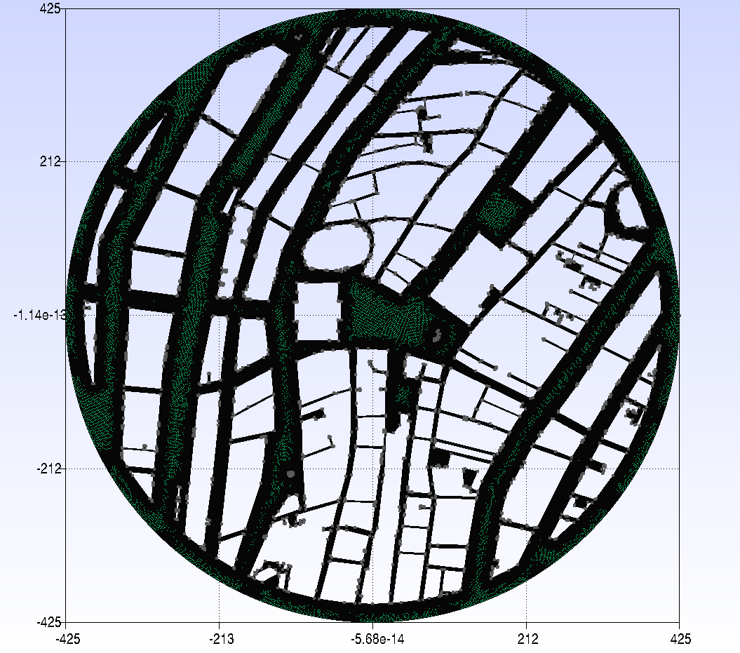Note that the mesh is very coarse close to the wall and needs to be refined for more accurate results. For resolved boundary layers the dimensionless wall cell size needs to be $y^{+} < 1$. We have also made some simplifications in the geometry and physics. Note that cutting to a circular shape means that at the edges the results are inaccurate because we are missing the effect of buildings outside of the circular area. Also note that assuming a 2D planar scenario is not accurate. We do not take into account the different heights of the buildings and we also do not take into account that the wind blows over the entire city and has a downward component as well. So although this simulation will not accurately represent the wind velocity through the streets in a quantitative way, at least qualitatively they give an impression of the accelerating wind speeds through the streets of the city center.